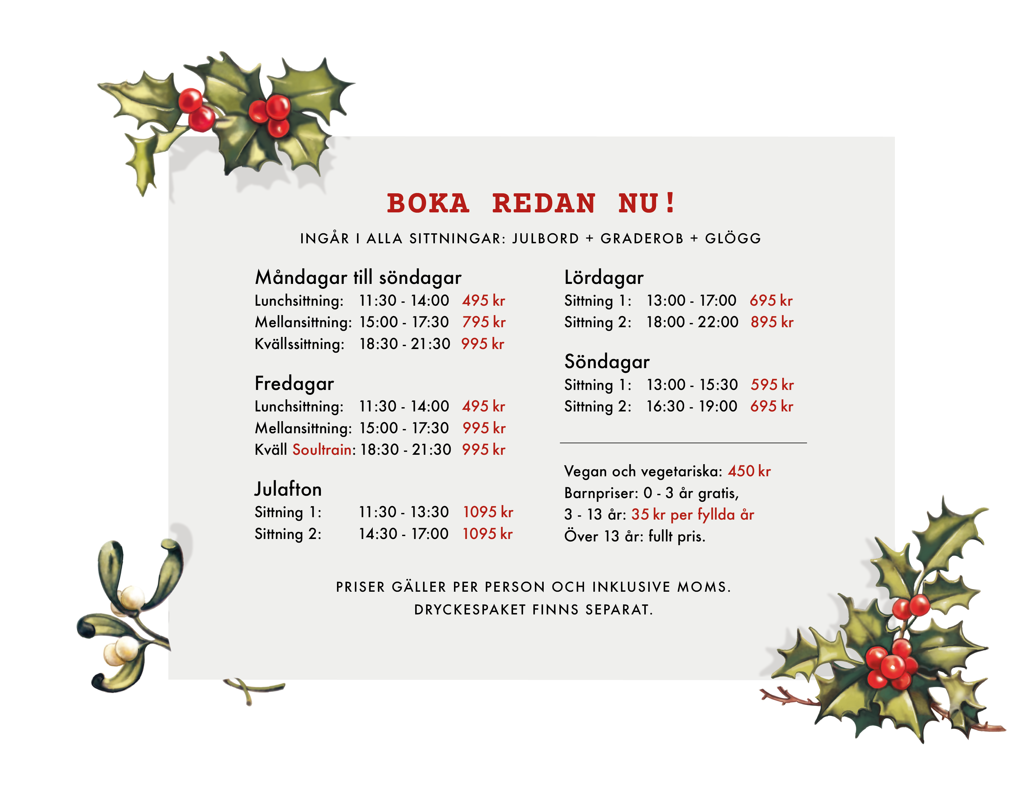 Från den 20 november fram till Julafton kan du välja på flera olika sittningar.
